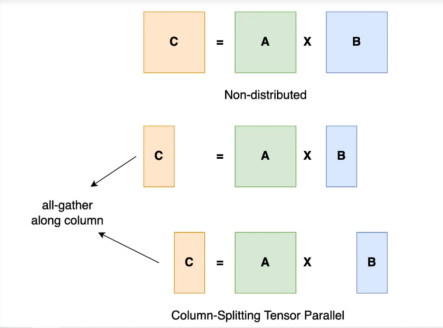 为了更好地理解张量并行,顾名思义,我们沿着特定的维度将张量分割成几块,这样每个设备只容纳张量的1/N块。使用这个部分块执行计算以获得部分输出。这些部分输出从所有设备收集而来,然后组合。