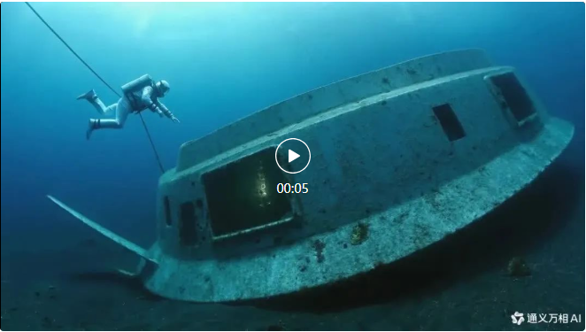 Prompt:电影质感,一名宇航员正在探索一艘水下外星船残骸。