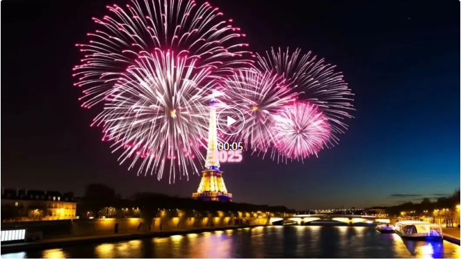 比如在塞纳河畔的埃菲尔铁塔附近,绚烂的烟花在空中绽放,随着镜头拉近,粉色数字「2025」逐渐变大,直到充斥整个画面。