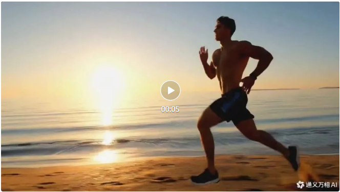 再比如下面这则生成视频中,男子奔跑时动作流畅自然,没有出现左右腿不分或者扭曲变形的问题。而且它还很注重细节,男子每一次脚尖触地都会留下印迹,并微微扬起细沙。
