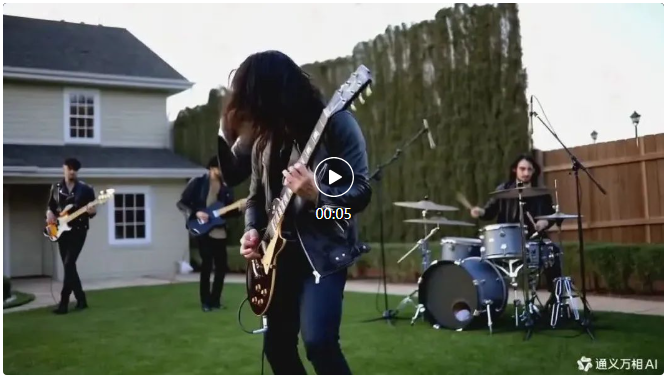我们输入 Prompt:摇滚乐队在前院草坪上演出,随着镜头的推进,画面聚焦到吉他手身上,他身穿皮夹克,一头凌乱的长发随节奏摆动。吉他手的手指在琴弦上快速跳跃,背景中其他乐队成员也在全情投入。