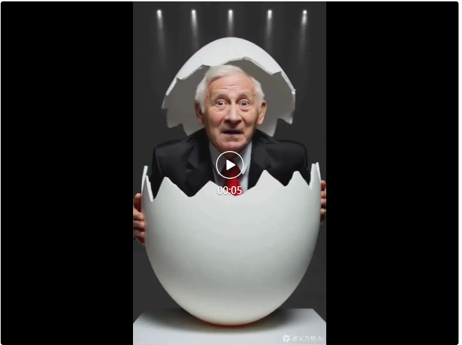 一位穿着西装的老人从鸡蛋中破壳而出,瞪大双眼紧盯镜头的白发老头,再配上公鸡咯咯叫的声音,画面相当搞笑。