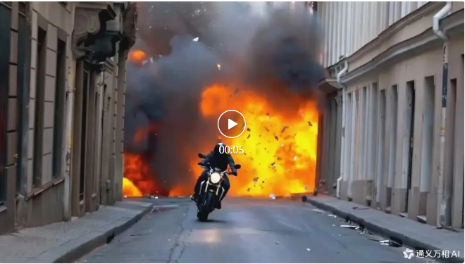 在以上这段长篇大论般的文本描述中,狭窄的街道、明亮的火焰、弥漫的黑烟、乱飞的碎片以及身着深色装备的骑手…… 这些细节都被通义万相捕捉到。