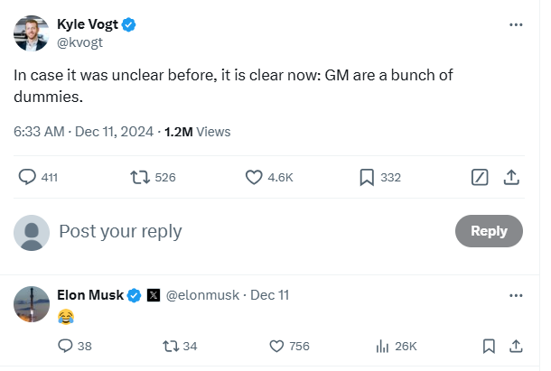 消息传出后,随后的几天引起了轩然大波。前 Cruise 联合创始人兼 CEO Kyle Vogt 甚至直接在社交平台上评价道,“如果以前不清楚,现在很清楚:通用汽车是一群傻瓜”,就连马斯克也赶来评论区围观吃瓜。
