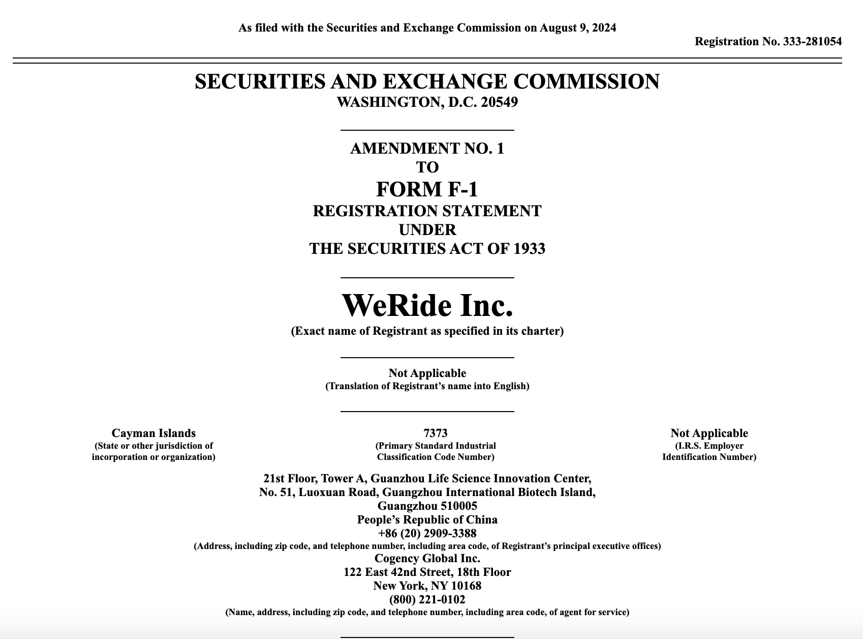 美国证券交易委员会星期五(8 月 9 日)提交的文件显示,WeRide 是一家开曼群岛控股公司,其业务主要由广州文远智行科技及其在中国大陆的子公司开展。文远知行将发行 645 万股美国存托股票(ADS),每股发行价为 15.50 至 18.50 美元,每股 ADS 代表三股普通股。