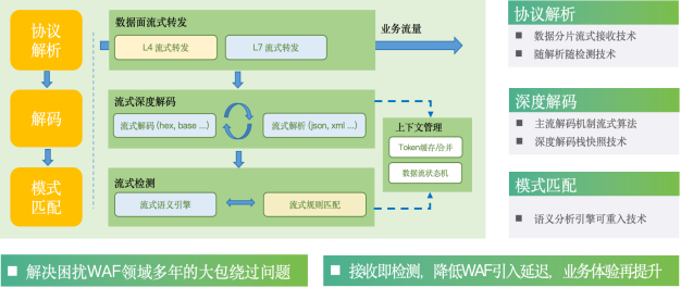 同时,雷池30的另一项新技术突破——流式语义分析技术,攻克了多年困扰行业的“大包绕过”难题。这项技术的核心突破在于实现了数据分片流式接收技术、深度解码栈快照技术、语义分析引擎可重入技术等多项创新,将协议解析、解码和模式匹配改造为“边接收、边检测、边转发”的流式检测模式。不仅有效解决了“大包绕过”问题,还在不牺牲检测效果的前提下大幅降低了检测延迟,为用户提供更优质的业务体验。