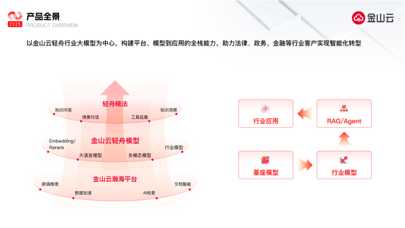 为满足垂直领域客户的数智化转型需求,金山云以轻舟行业大模型为中心,构建平台、模型到应用的全栈能力,助力法律、政务、金融等行业客户实现智能化转型。