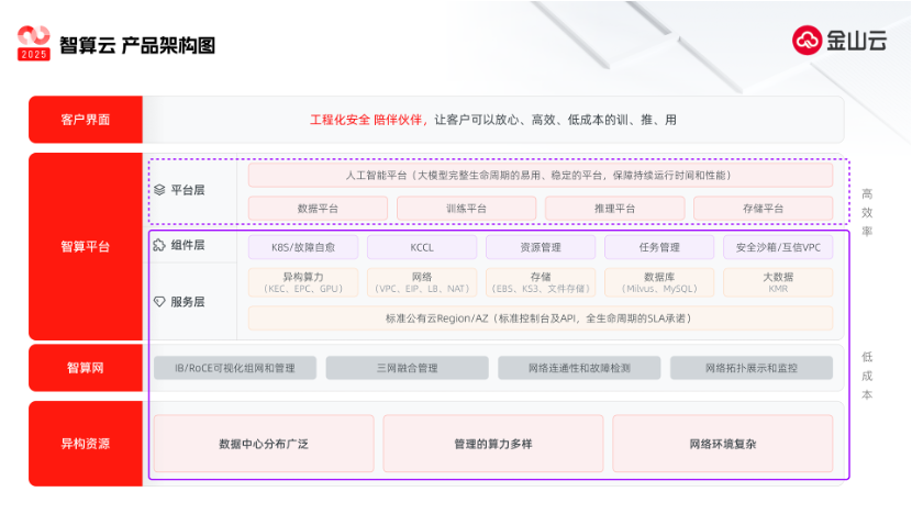 洞察智算云趋势,金山云围绕基础云、智算网及智算平台,构建了智算云1.0能力体系,且正在向平台化和Severless演进的智算云2.0迈进。在基础云方面,公司通过整合软硬一体化能力,对计算、存储、网络进行全面升级,构建高性能基础设施,这为智算云发展奠定了坚实基础。