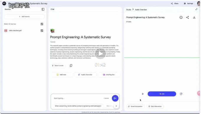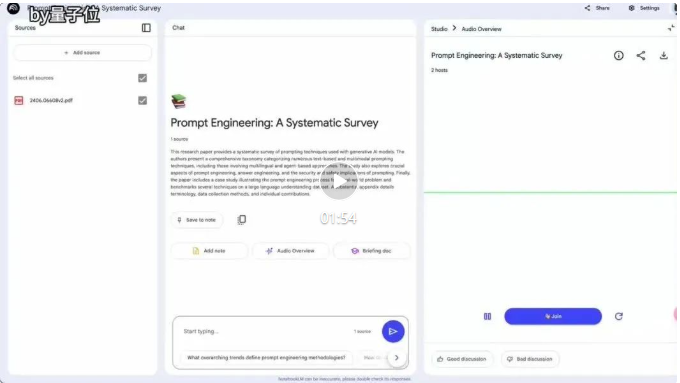新界面将内容组织成三个区域:左边的“来源(Source)”面板用于上传信息,中间的“聊天(Chat)”面板用于与 AI 聊天机器人讨论来源,以右边的“工作室(Studio)”面板,用于制作音频概览和学习指南等。