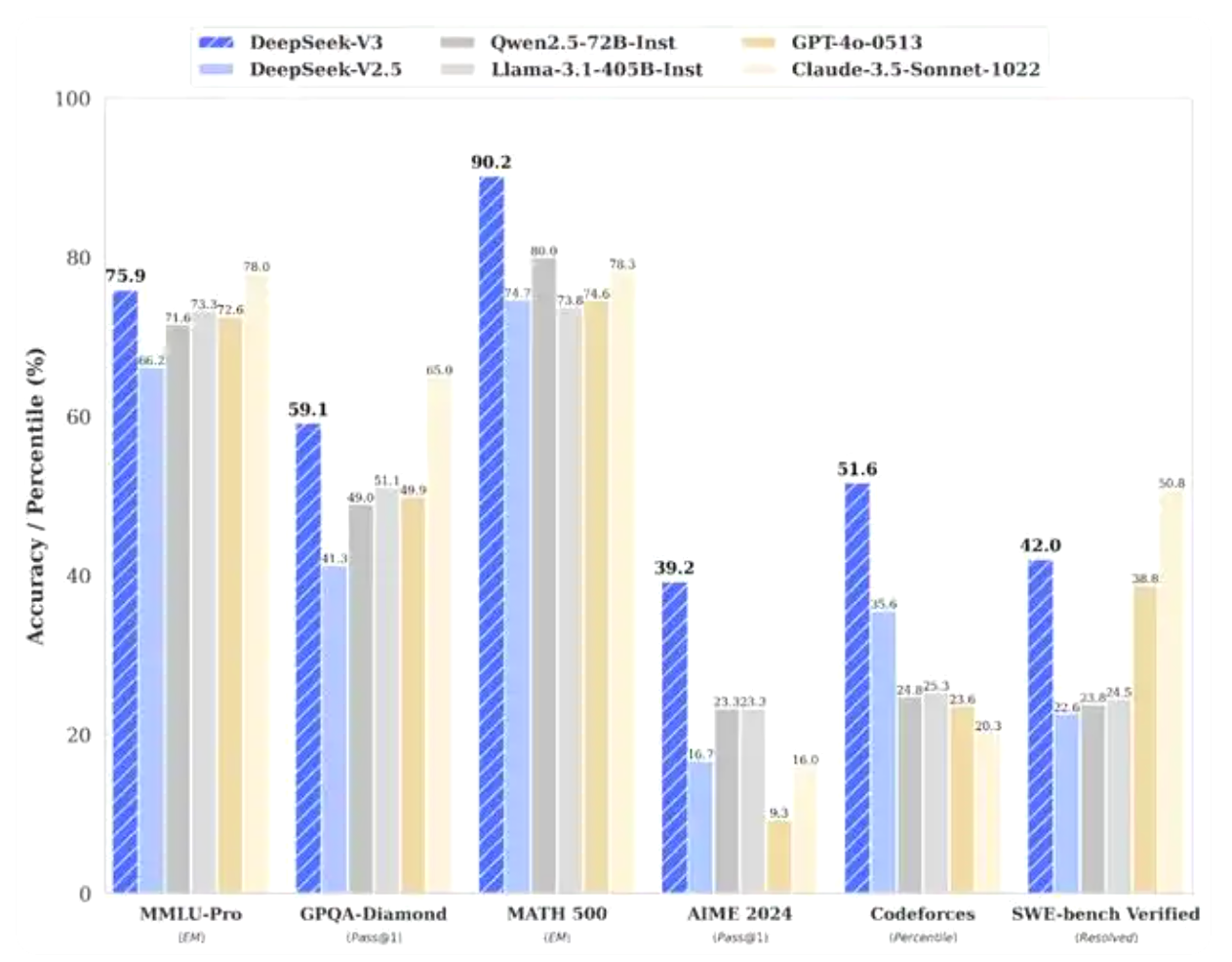 根据DeepSeek公布的测试结果,其运行了多项基准测试来比较性能,V3模型已明显优于包括Meta公司的Llama-3.1-405B和阿里云的Qwen 2.5-72B等一众领先开源模型。在大多数基准测试中,它甚至部分超越了OpenAI的闭源模型GPT-4o。